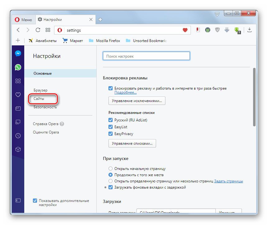 В открывшемся окне настроек переместитесь в раздел «Сайты».