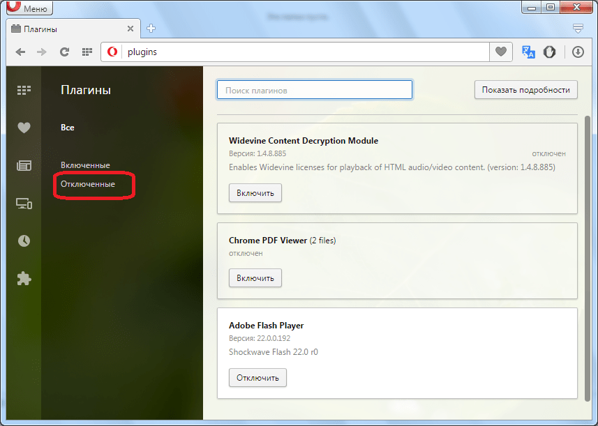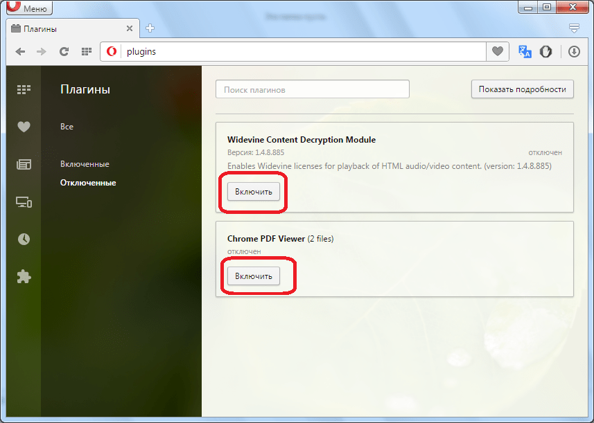 Перед нами предстают нефункционирующие плагины браузера Опера. Для того, чтобы возобновить работу, достаточно нажать на кнопку «Включить» под каждым из них.