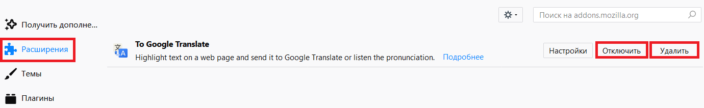 - Для отключения плагина нужно нажать на кнопку Отключить» напротив названия расширения. В случае необходимости удаления плагина нужно нажать на кнопку Удалить» напротив названия расширения.
