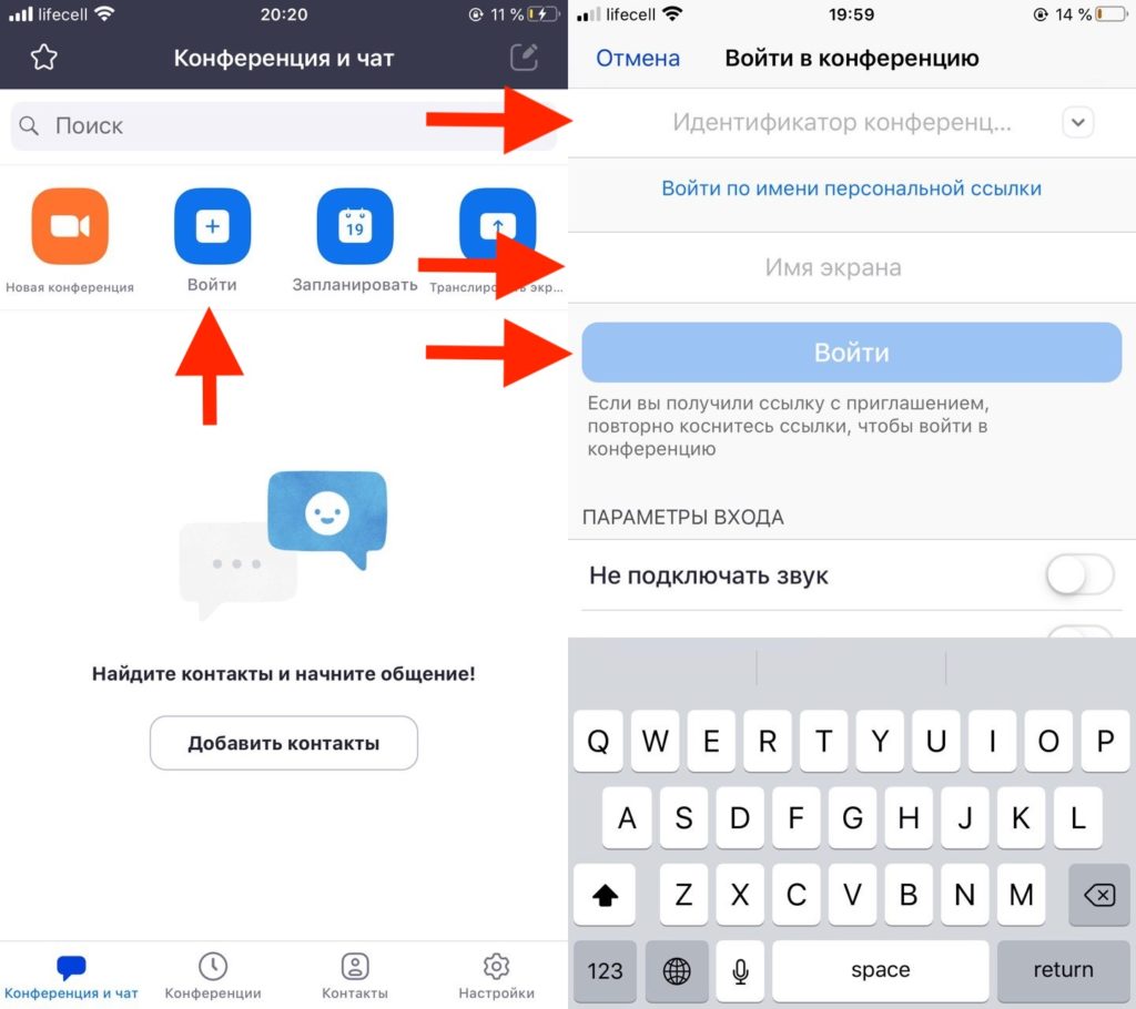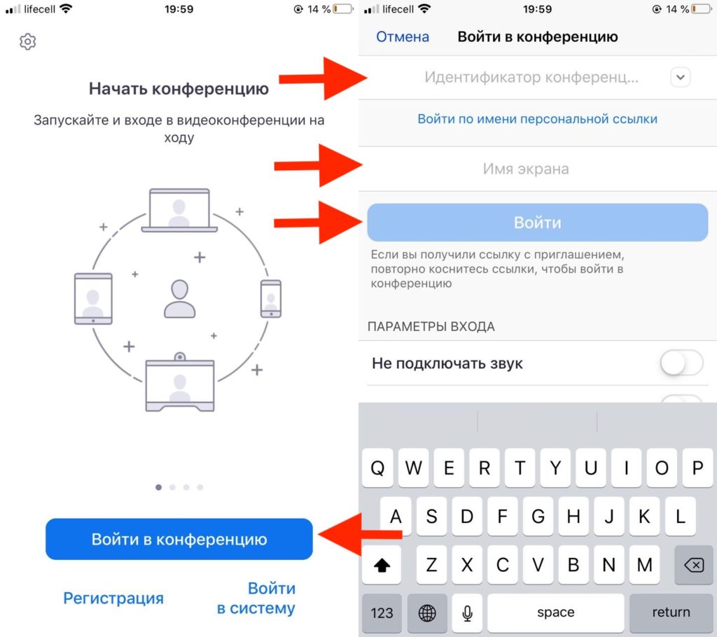 Через ПК. Запустив программу, нажимаем Войти. Дальше «ID конференции», «имя» и нажимаем ещё раз Войти.