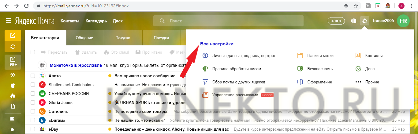 Зайдите в ваш почтовый ящик в Яндекс.Почте и кликните мышью по значку в виде шестеренки в правом верхнем углу.