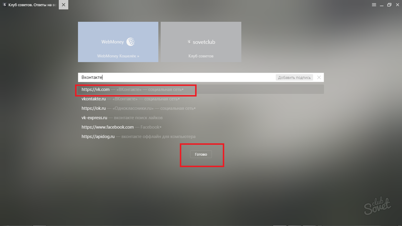 Введите название или адрес сайта, выберите его из списка ниже и нажмите “Готово”.