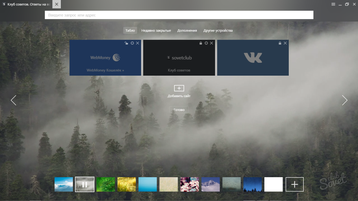 Для настройки Табло нажмите кнопку «Добавить» под плитками визуальных закладок. По умолчанию здесь отображаются страницы, которые вы недавно посещали. Но если вы добавите нужные вам сайты и закрепите их они всегда будут под рукой. Для настройки фона изображение можно выбрать из галереи фонов Яндекс.