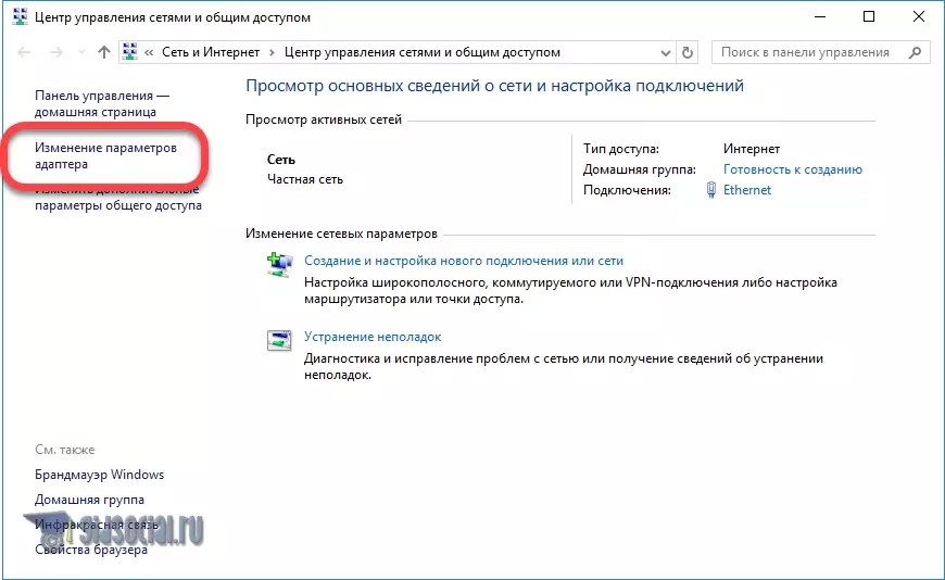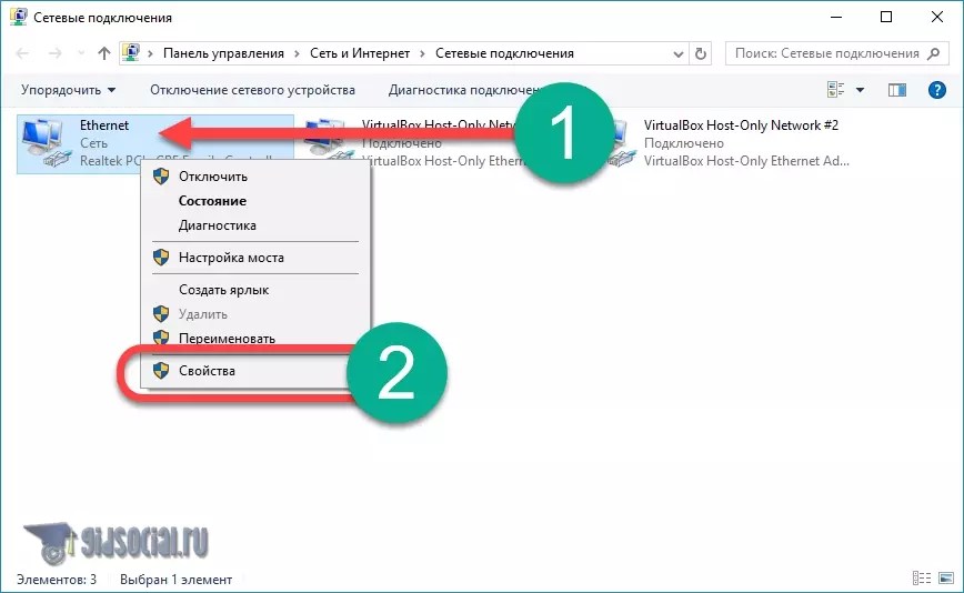 - Далее нужно перейти к свойствам адаптера подключения к сети. Для этого сделайте по его значку правый клик и выберите пункт, обозначенный на картинке.