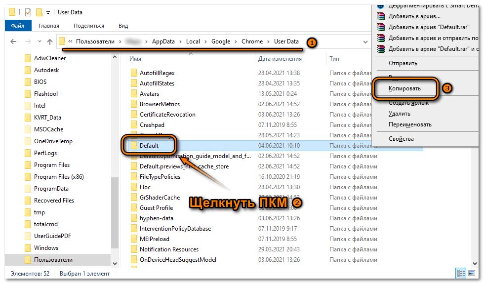 После этого щелкните правой клавишей мыши по папке Default и выберите функцию копирования. Можно использовать комбинацию клавиш Crtl + C. Затем вставьте каталог в любое удобное место с помощью контекстного меню или клавиш Ctrl + V.