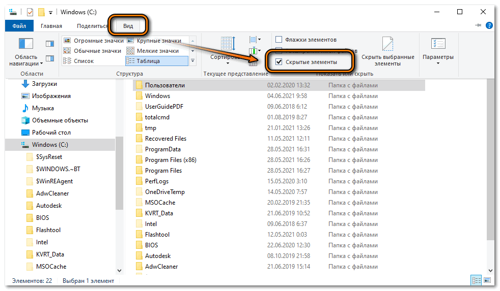 Прежде, чем перейти по папкам, в Проводнике необходимо активировать отображение скрытых элементов. Сделать это возможно через вкладку «Вид».