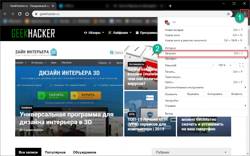 Запускаем Хром, кликаем по кнопке с тремя точками, в появившемся меню выбираем Загрузки . Также можно просто нажать на клавиатуре Ctrl+J