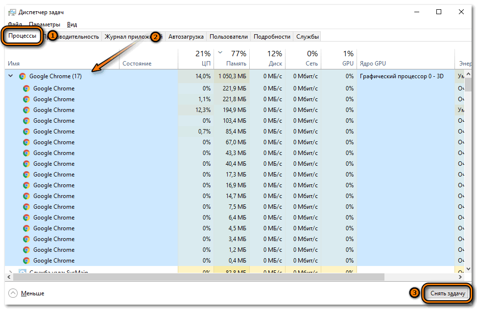 3. По показателю в колонке ЦП (нагрузка на процессор в процентах) найдите наиболее ресурсоёмкий процесс. В первую очередь рассматривайте объекты с показателем 80-90%.
