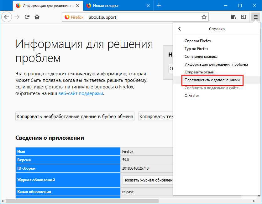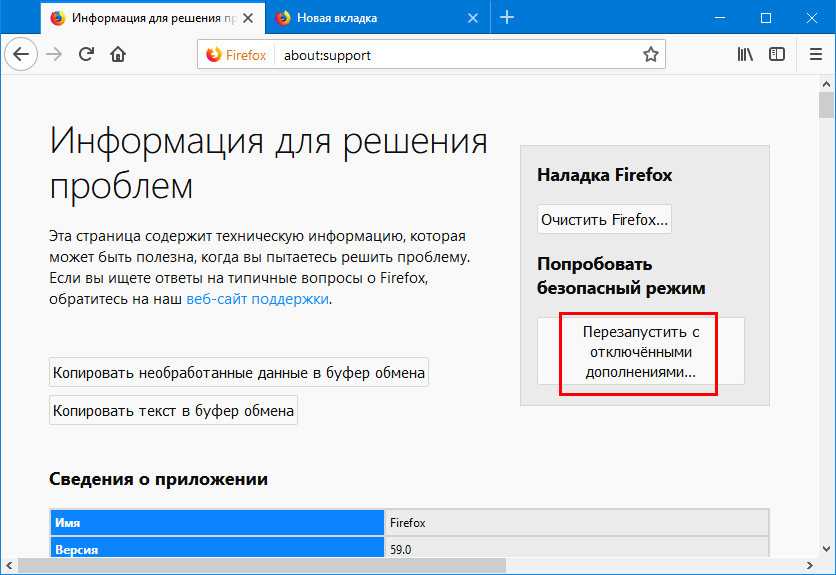 В качестве временных мер ускорить работу Firefox можно, перезапустив его с отключенными расширениями. Для этого на странице about:support жмем «Перезапустить с отключенными дополнениями».