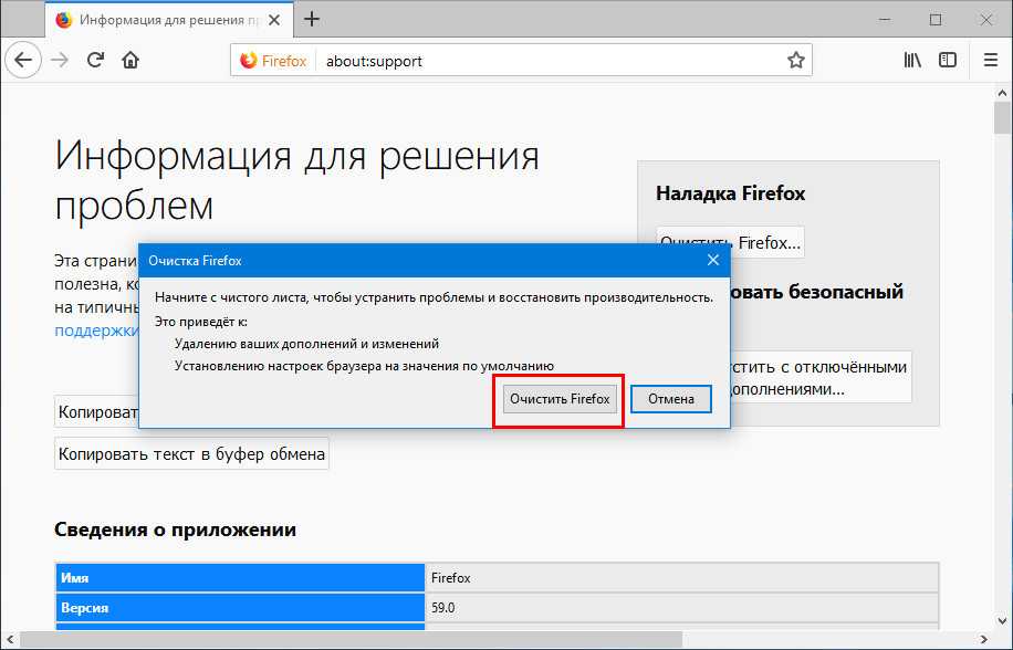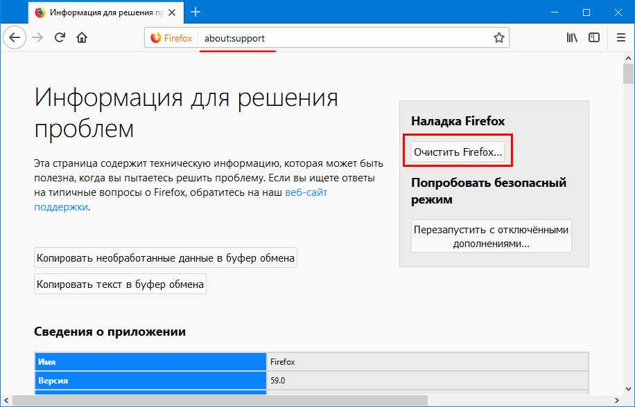 В последней версии программы есть функция очистки, сбрасывающая браузер к исходному состоянию без потери данных. Чтобы ею воспользоваться, перейдите в Firefox по внутреннему адресу about:support и нажмите кнопку «Очистить Firefox».
