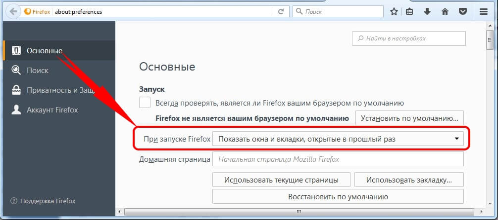 Чтобы при каждом новом запуске «Мозиллы» у вас «автоматом» открывались вкладки из старой сессии, у вас должна быть включена специальная опция в настройках: