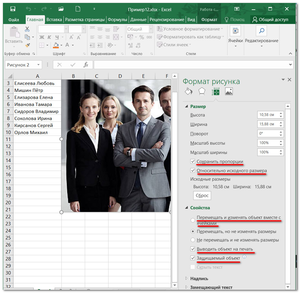 Ну а чтобы выполнить «тонкую настройку» всех возможных параметров объекта, кликните по нему и нажмите Ctrl+1. В открывшемся диалоговом окне будет полный перечень всех настроек картинки: цвет, контур, формата текста, тени, яркость, контрастность, разрешение выводить на печать, привязка к ячейкам и многое другое. Описание всех настроек заняло сделало бы статью в несколько раз длиннее, поэтому оставляю их Вам на самостоятельное изучение.