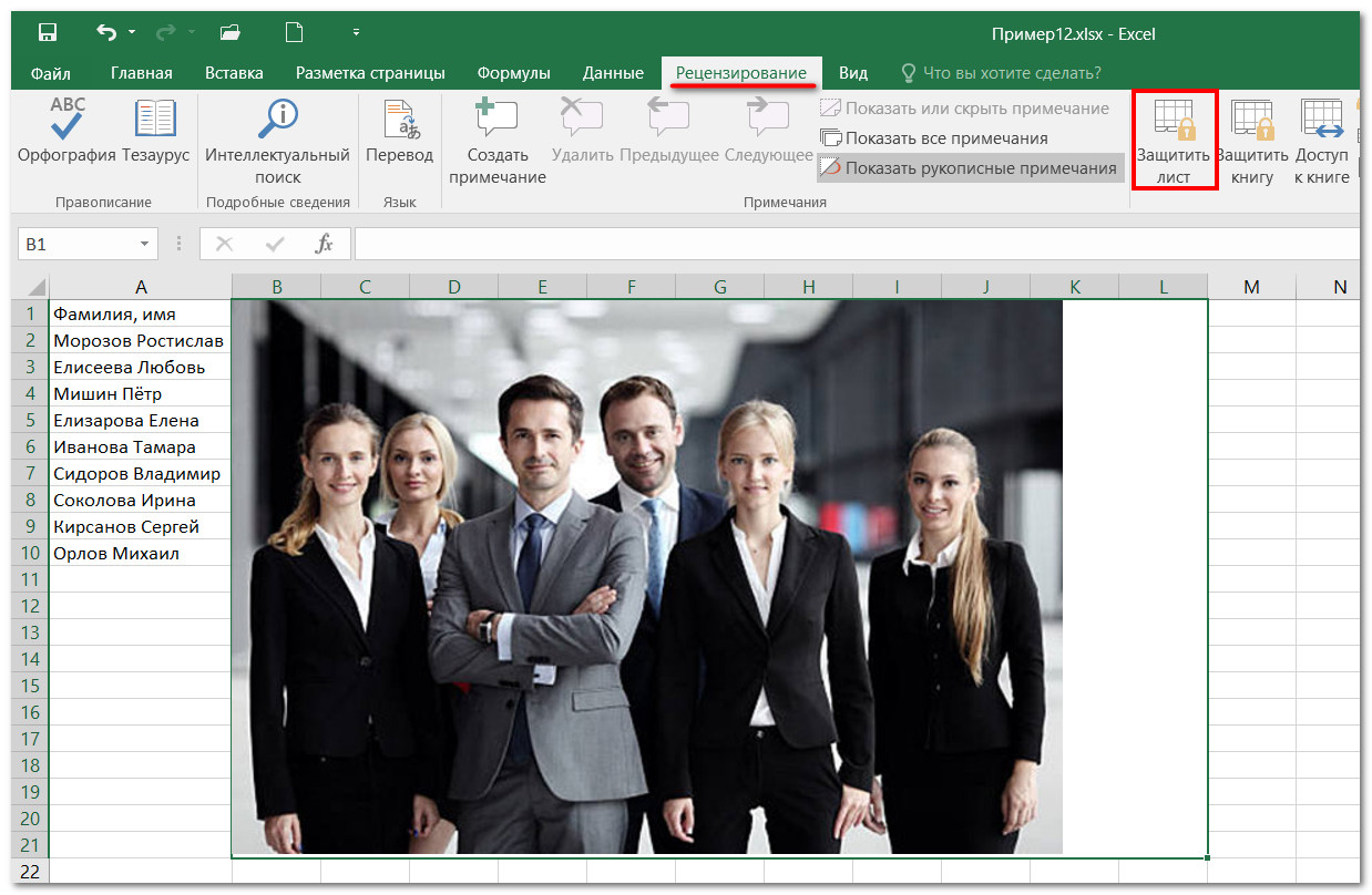 Он лишь создаёт потенциальную возможность защиты посредством активации параметра «Защитить лист» на вкладке «Рецензирование», которая будет произведена ниже. Поэтому дезактивировав параметр «Защищаемая ячейка», мы тем самым вывели весь лист из возможности последующей защиты. Для чего это делается? Чтобы в дальнейшем защитить только ту ячейку, к которой привязывается изображение. Все же остальные будут открыты для изменений.