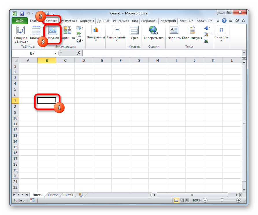 - Выделите любую ячейку – это пока не имеет значения. Далее перейдите во вкладку «Вставка» и нажмите по значку «Рисунки». Иногда, если окошко программы маленькое, вы не сразу сможете найти этот значок. В таком случае нужно нажать по кнопке с надписью «Иллюстрация», чтобы полностью раскрыть подраздел.