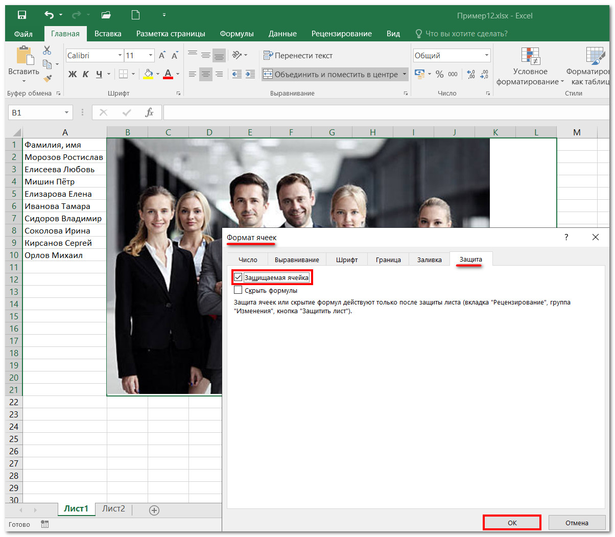- А вот теперь выделим ячейку с фотографией, и в том же окне активируем параметр ««Защищаемая ячейка».