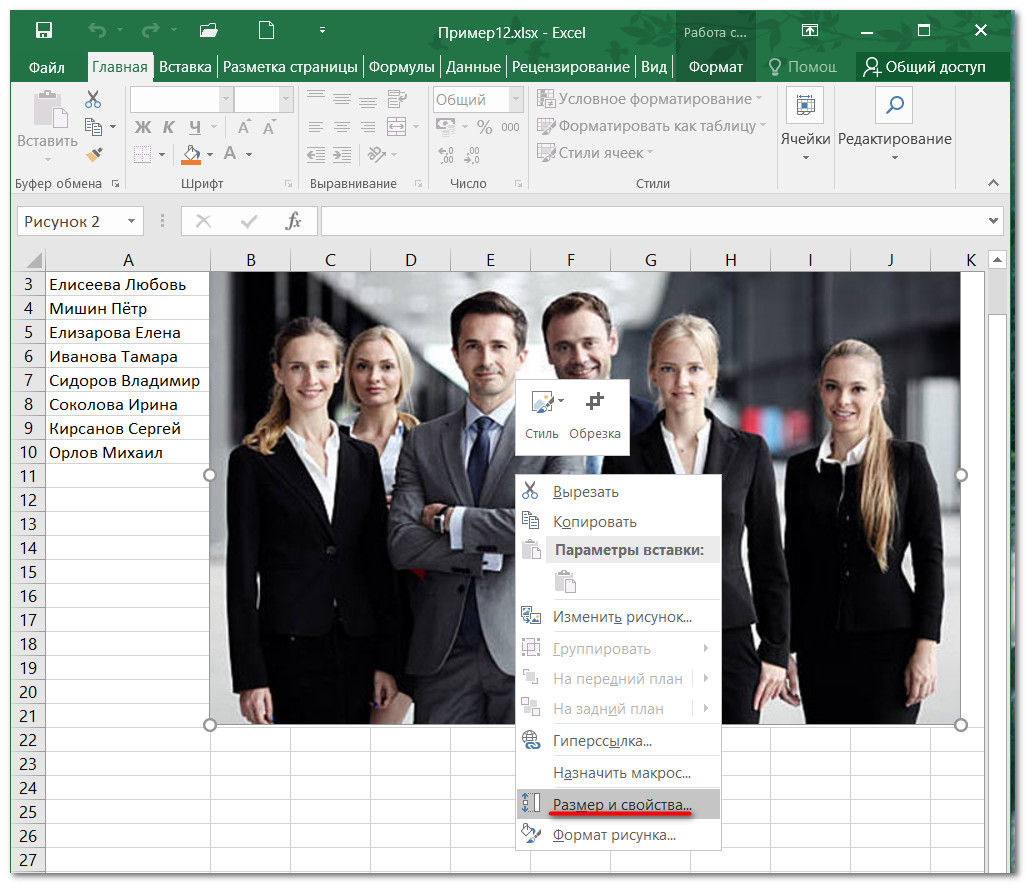 - Если мы желаем осуществить вставку картинки в ячейку, то необходимо отредактировать изображение таким образом, чтобы ее размеры совпадали с размерами самой ячейки. Редактирование размера осуществляется следующими методами: через окошко «Размеры и свойства»; перемещение границ рисунка при помощи ЛКМ; использование инструментов на ленте, а также контекстное меню.