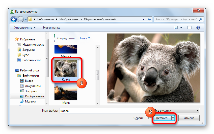 - На экране отобразилось окошко под названием «Вставка рисунка». Стандартно оно всегда отображается в папке «Изображения». Существует возможность заранее перекинуть в эту папку то изображение, которое мы планируем вставить на рабочий лист табличного процессора. Альтернативный вариант – оставаясь в этом же окошке, перейти в другую папку накопителя персонального компьютера или же подсоединенного съемного носителя. По завершению всех манипуляций, по выбору изображения, щелкаем на кнопочку «Вставить».