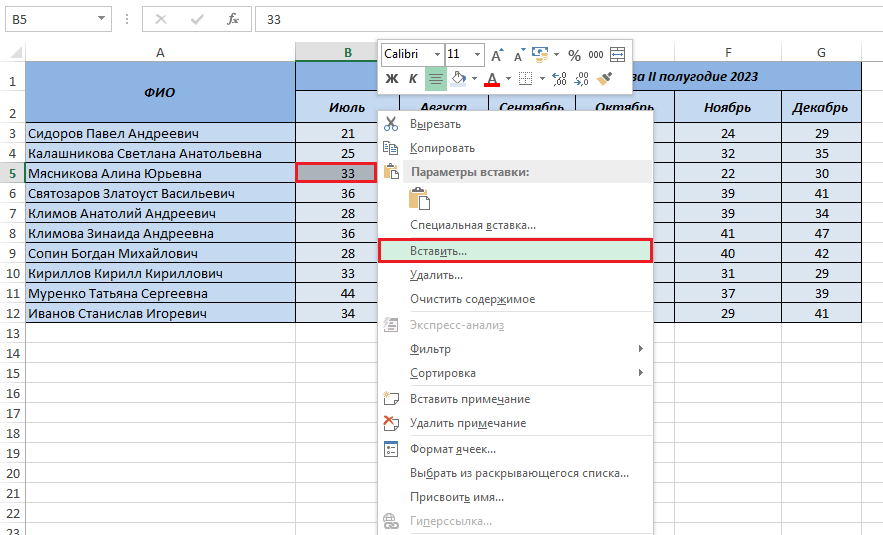 - Нажмите по выделенной ячейке правой кнопкой мыши и выберите из контекстного меню пункт «Вставить». Вы также можете воспользоваться комбинацией клавиш Ctrl+, чтобы быстро вызвать нужное окно.