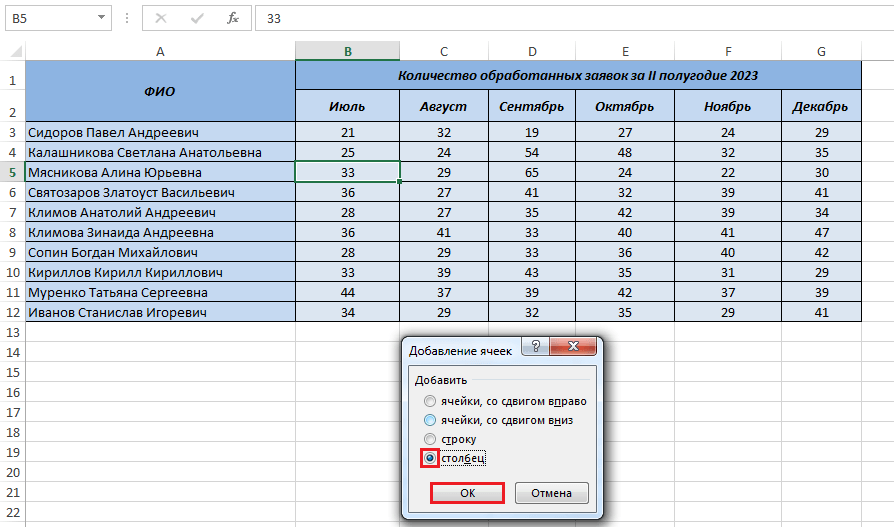 Как вставить столбец в Excel