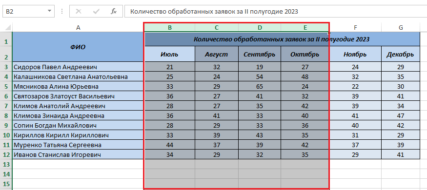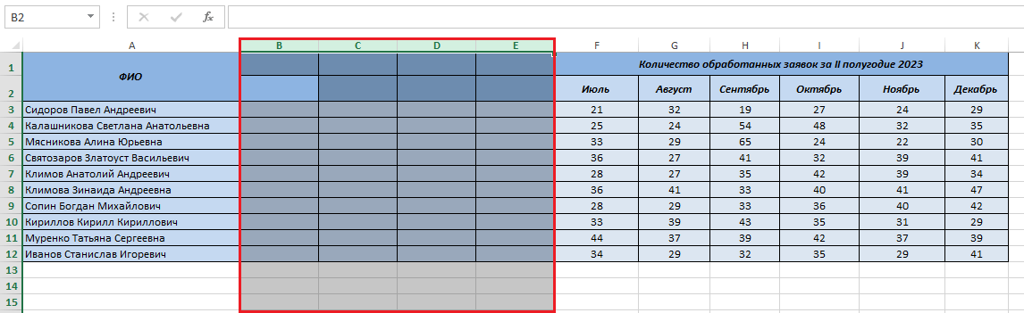 Для примера, добавим 4 новых столбца внутрь уже существующей таблицы. Для этого выделяем колонки В, С, D, E— достаточно нажать по всем буквам по очереди, зажав SHIFT.