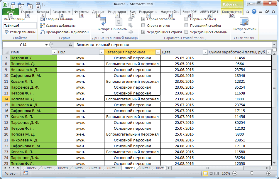 Активированная вкладка «Конструктор» раскрывает инструментарий, облегчающий процесс редактирования объекта. Для автоматизации работы пользователь устанавливает переключатели на инструментах «Строка заголовка» и «Строка итогов». Последняя опция позволяет провести расчеты по выбранной формуле. Для этого пользователь раскрывает список посредством нажатия на стрелку в итоговой ячейке и выбирает функцию.