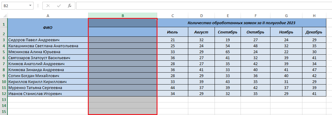 Для примера добавим столбик для данных в таблицу между колонками А и В. Чтобы вставка столбца была выполнена корректно, необходимо правильно определить область выделения. Здесь достаточно запомнить простое правило — новая колонка будет вставляться слева от текущего выделения. Таким образом, чтобы вставить новый столбец: