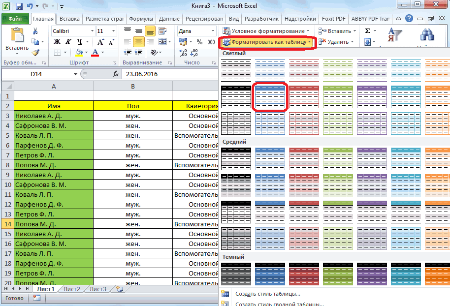 - В контекстном меню будет предоставлен выбор стилей таблиц. Он не имеет особого значения, поэтому выбирайте тот, который считаете для себя более привлекательным.
