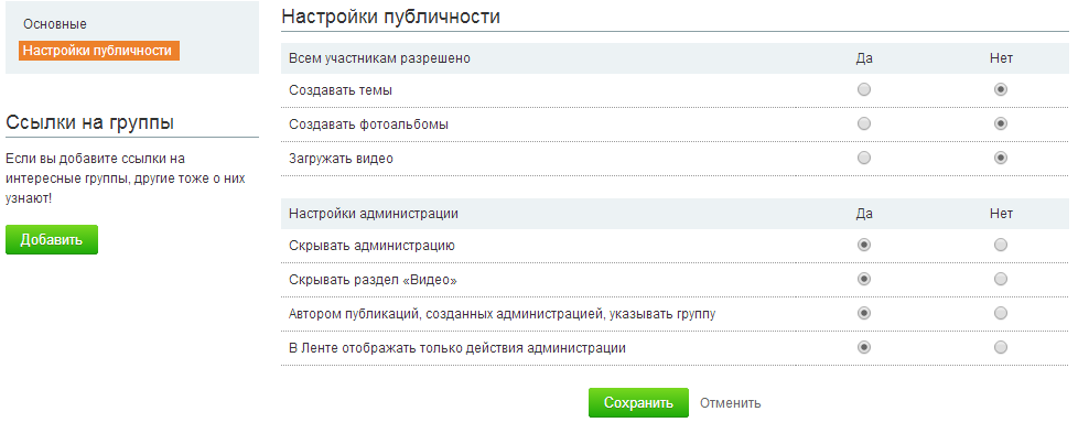Настройки публичности — наиболее важный пункт в настройках группы в Одноклассниках. Если ты отыскал эту кнопочку на странице и нажал на неё, то перед тобой появится вот такое окошко: