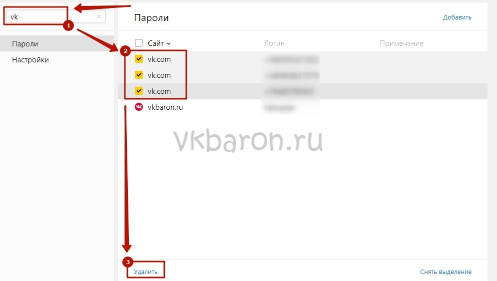 Браузер перебросит вас на страницу со всеми сохраненными данными от посещенных сайтов. Вбейте в поисковую строку vk.com . Найдите ваш номер телефона или почту (в зависимости от того, что вы вводили при входе) и удалите его.