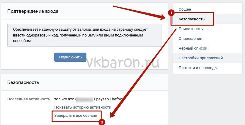 После этого справа переключитесь на вкладку «Безопасность». Рядом с пунктом «Последняя активность» вы увидите кнопку «Завершить все сеансы» — нажмите на нее, чтобы выйти из аккаунта ВК на всех устройствах.