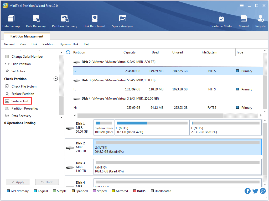 Чтобы интуитивно увидеть состояние вашего внешнего жесткого диска, вы можете попробовать MiniTool Partition Wizard. Его функция Surface Test будет сканировать диск и отмечать плохие сектора красный. Более того, с помощью этого набора инструментов вы можете сделайте резервную копию вашего компьютера на внешний жесткий диск с легкостью.