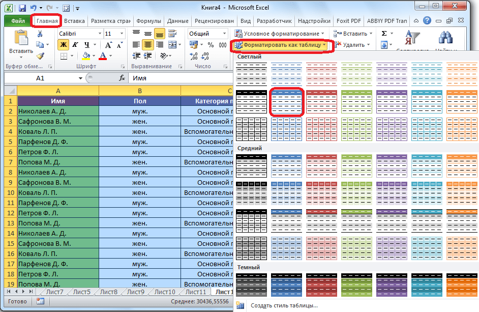 - Переключаемся во вкладку “Главная”. Отмечаем массив данных (в нашем случае – вся таблица с шапкой). В разделе “Стили” кликаем по кнопке “Форматировать как таблицу” и в открывшемся перечне нажимаем по наиболее понравившемуся стилю оформления таблицы.