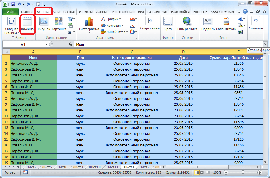Альтернативным вариантом является создание таблицы с закрепленной шапкой во вкладке «Вставка». Для этого, нужно перейти в указанную вкладку, выделить область листа, который станет «умной таблицей», и нажать на находящуюся в левой части ленты кнопку «Таблица».