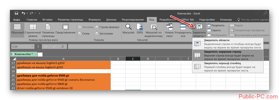 Откройте вкладку «Вид» и воспользуйтесь пунктом «Закрепить области».