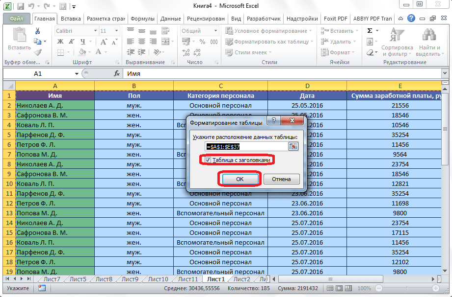 В версиях Excel, начиная с 2007, появилась возможность задавать формат таблиц. При этом область данных с заданным стилем автоматически преобразуется в таблицу, с которой удобно работать. При соответствующей настройке программа выделяет первую запись как строку заголовков и автоматически устанавливает фильтры по каждому столбцу.