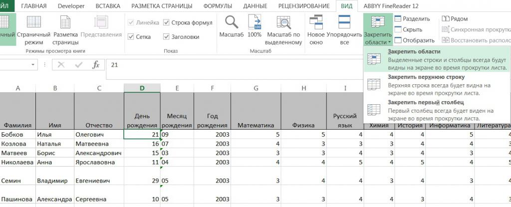 В таблице успеваемости студентов в первых трех столбцах содержится фамилия, имя и отчество учащегося. Если мы хотим видеть все эти данные при перемещении по листу, нужно закрепить не только первый столбец. Проверим, как зафиксировать шапку в Excel, состоящую из нескольких столбцов.
