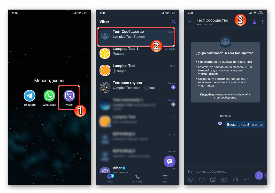 - Запустите Вайбер, откройте группу или сообщество. Напишите сообщение, требующее привлечения внимания других участников чата, или найдите таковое в переписке.