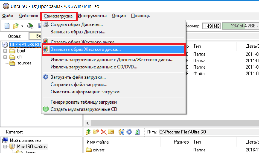 Нужно добавить, что с помощью программы UltraIso вы также можете записывать образы дисков на флеш накопители. Для этого вам нужно открыть образ диска в программе UltraIso (так как это описано в шаге № 1), а потом открыть меню «Самозагрузка – Записать образ Жесткого диска»