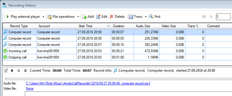 После того, как вы закончили разговор, найдите свою запись в «Истории». Чтобы найти папку с записями нажмите на кнопку «Recording folder». Папку можно изменить по желанию на любую другую на компьютере и все записи будут сохраняться в нее.