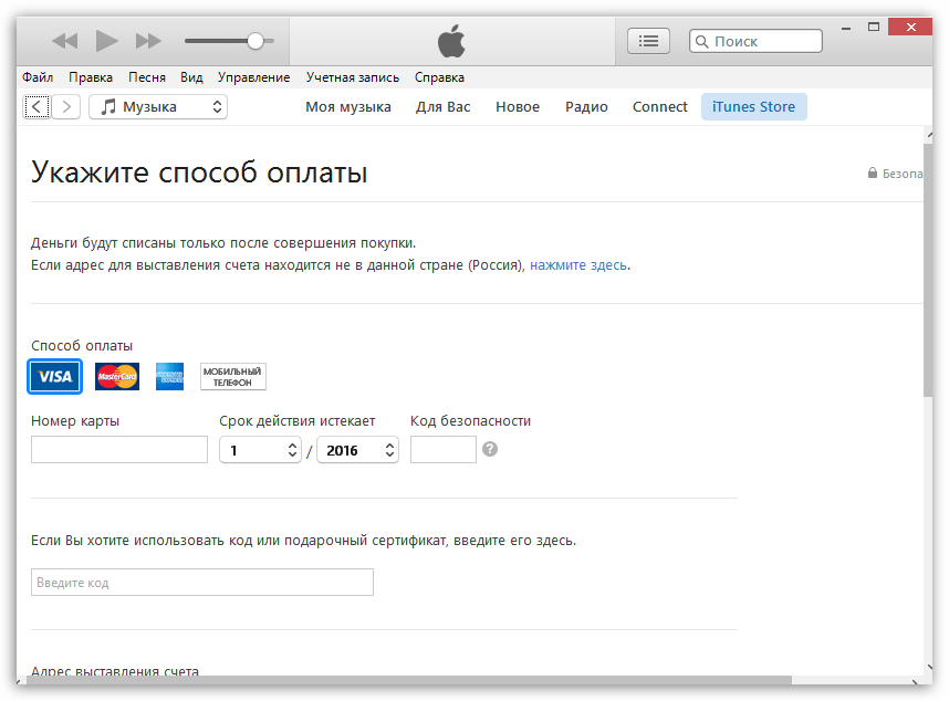 . Выберите способ оплаты и введите платёжные реквизиты. Необходимы те же данные, что и при регистрации через iTunes