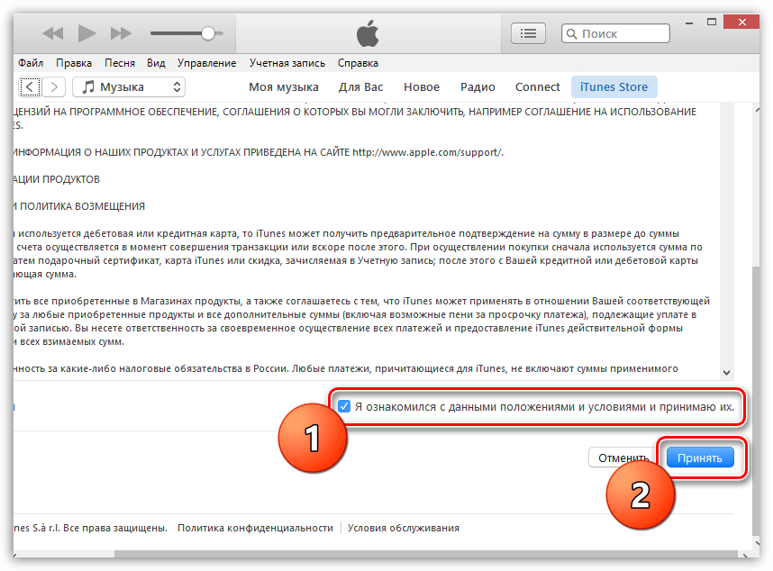 Вам необходимо будет согласиться с условиями, которые ставит перед вами Apple. Для этого поставьте галочку около пункта «Я знакомился с данными положениями и условиями и принимаю их», а затем щелкните по кнопке «Принять».