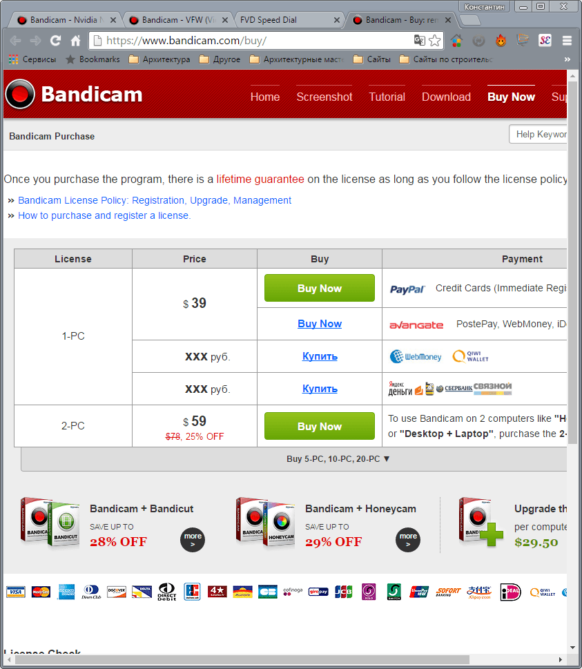 3.Откроется страница, на которой пользователю предложат приобрести следующие версии программы: для одного ПК, для двух ПК, Bandicam + Bandicut, а также доступно улучшение лицензии.