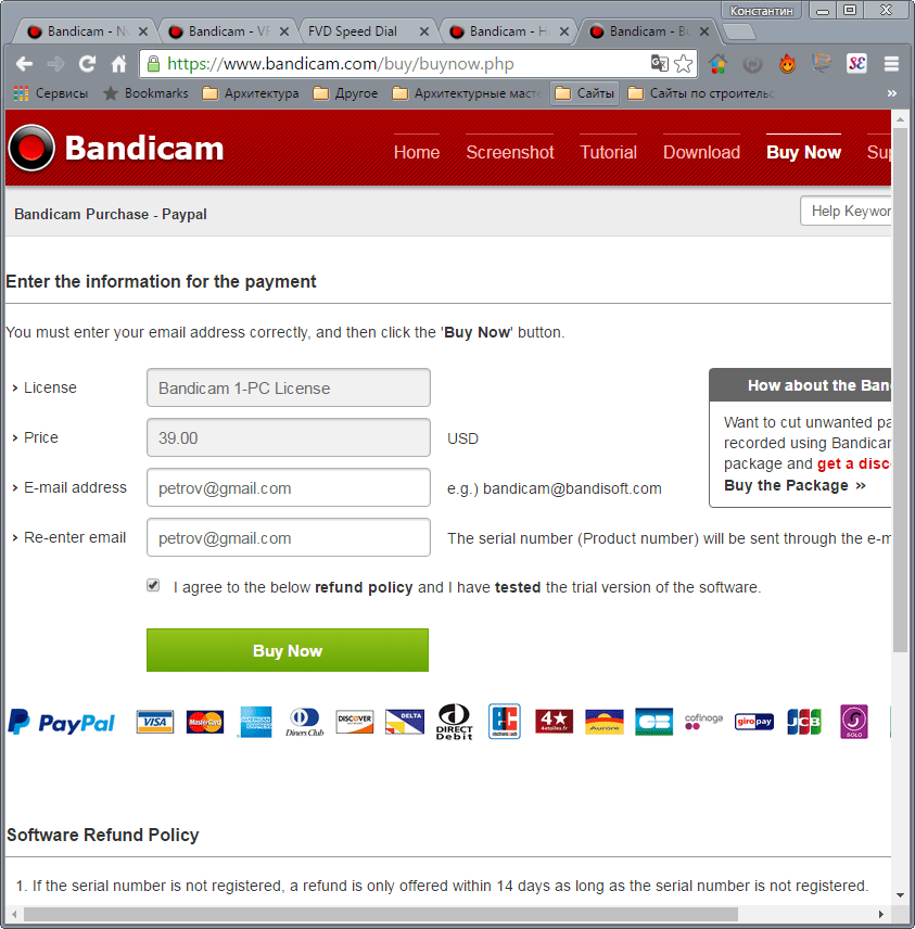 2. Нажимаем «Купить онлайн». Интернет-браузер автоматически открывает страницу покупки программы на официальном сайте разработчика Bandicam.