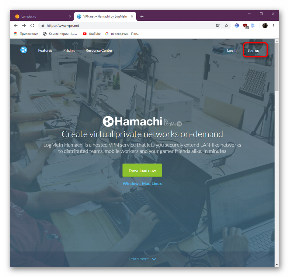 Поскольку использовать VPN можно только через официальное приложение Hamachi, вам все равно придется его качать. Поэтому вы можете не регистрироваться через сайт, а сделать это непосредственно в программе. Для начала вам необходимо скачать инсталлятор. Откройте ссылку https://www.vpn.net/ и нажмите кнопку Download now. Сайт предлагает разные версии для операционных систем Windows, Mac или Linux.