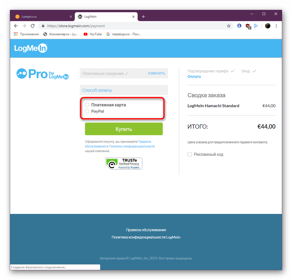 Если вы собираетесь сразу приобретать одну из подписок Hamachi, то проще будет пройти регистрацию на шаге покупки, чтобы не выполнять дополнительных действий и потратить немного меньше времени. При этом следует сразу же активировать почту, чтобы платеж прошел, поэтому убедитесь в том, что вы можете сейчас войти на используемый почтовый сервис. Далее потребуется следовать такой инструкции: