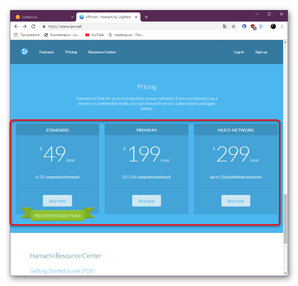 Еще один вариант создания аккаунта подразумевает переход к нужной странице через покупку услуг. Поскольку за часть возможностей Хамачи нужно платить (больше 5 компьютеров в сети, новые топологии сети, управление через личный кабинет), вы можете заранее выбрать подходящий тариф: