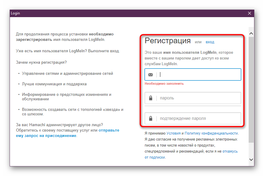 В обоих случаях вы окажетесь на одной и той же странице для создания учетной записи LogMeIn, которая в дальнейшем будет использоваться при работе с сервисом Hamachi. Рассмотрим процедуру регистрации более детально: