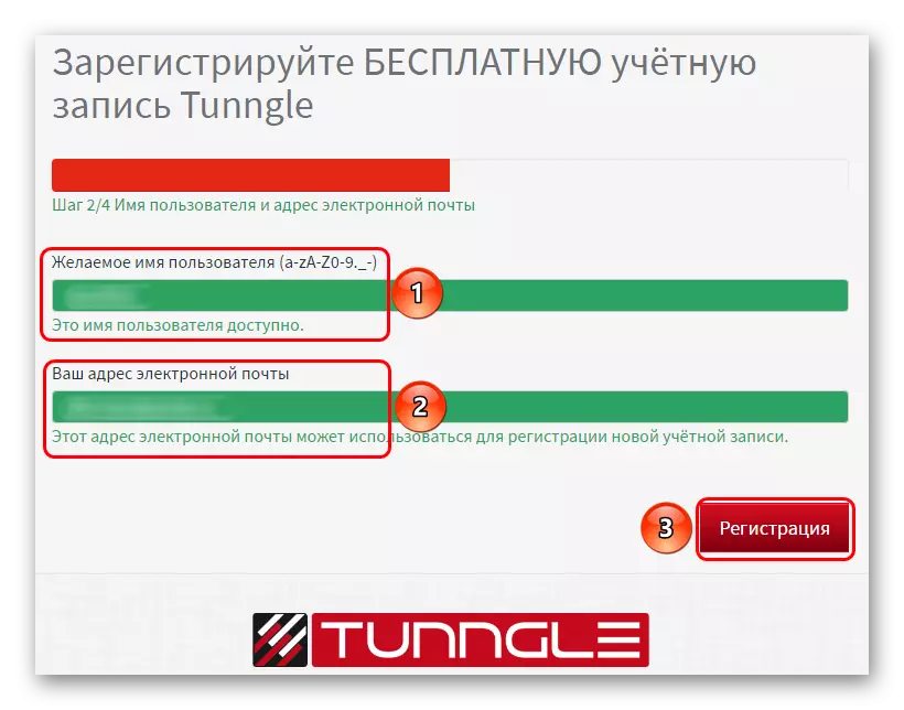 Далі потрібно придумати ім’я користувача, яке буде в подальшому використовуватися в якості логіна і позначення гравця в чаті Tunngle. Також необхідно вказати адресу дійсної електронної пошти. Після цього потрібно натиснути відповідну кнопку для підтвердження введення даних.