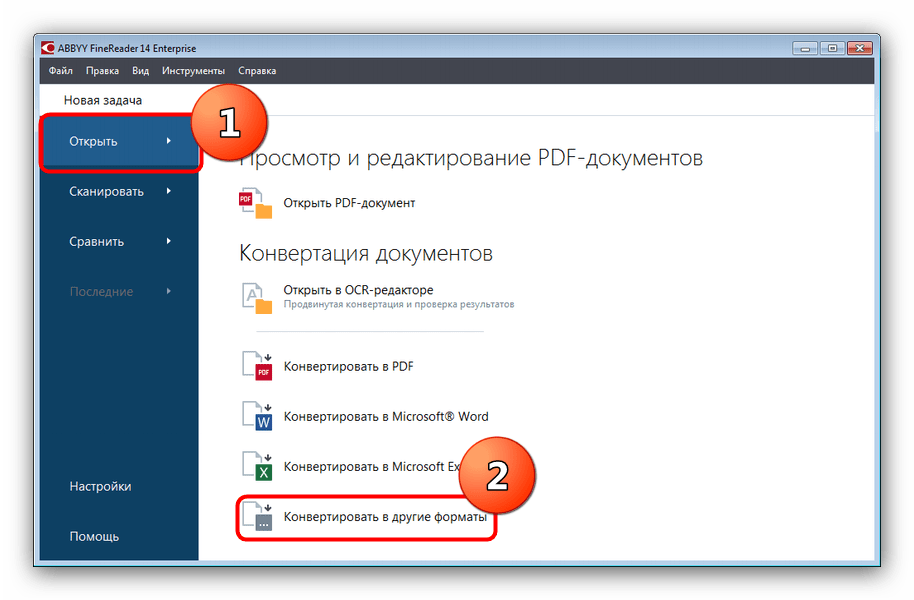 - Откройте приложение. Нажмите на «Открыть» в меню слева и щёлкните по пункту «Конвертировать в другие форматы».