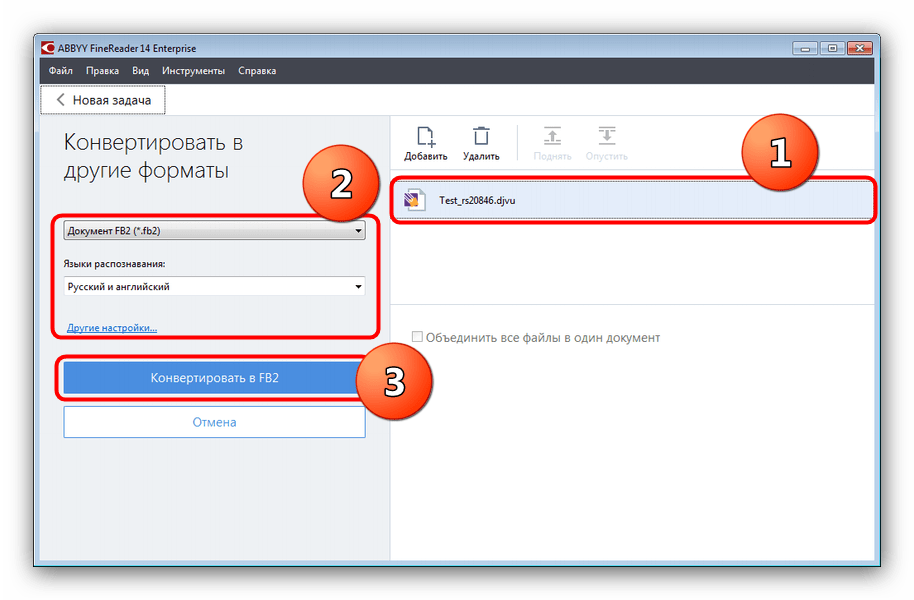Запустится инструмент конвертирования. Первым делом выделите мышкой конвертируемый файл в правой части окна. Затем выберите выходной формат «FB2» в выпадающем списке. Далее настройте языки распознавания и иные параметры, если потребуется. Проверьте настройки и нажмите «Конвертировать в FB2».
